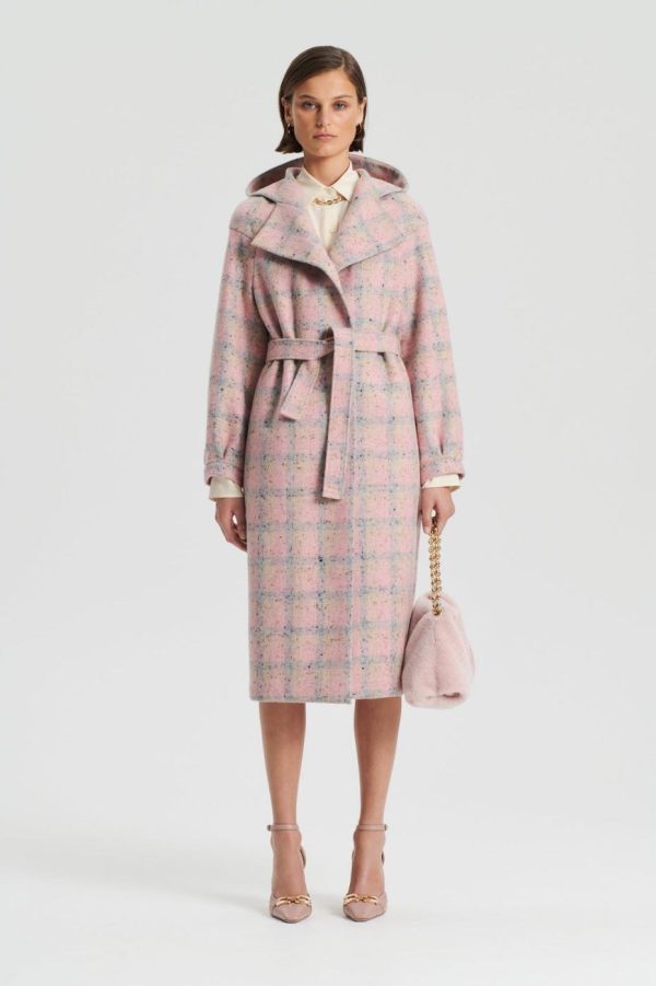 The Plaid Hooded Duffle interplays timeless design codes with refined detailing. Crafted from 100% virgin wool, the enveloping silhouette showcases an elegant plaid motif in tones of rose, pale blue and lemon. Featuring a high, wrap neck that can be styled as a wide v-neckline and open collar, the coat is detailed with a hood. Tailored to fall below the knee, the belted waist adds dimension to the relaxed shape. Pair over denim ensembles for a refined daily ensemble and style with tactile accessories in complementary hues.