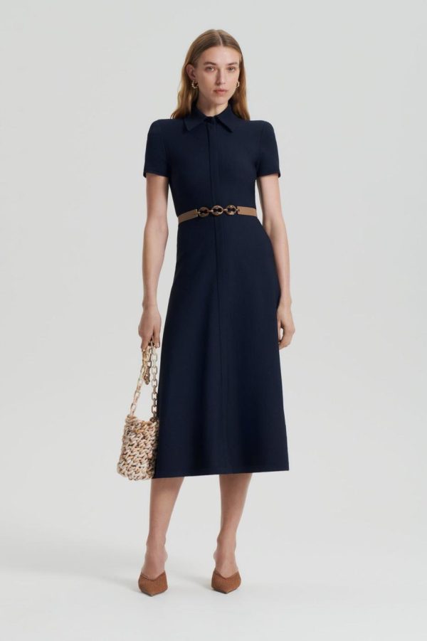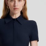 The Crepe Knit Zip Shirt Dress in navy embodies timeless femininity. Crafted from Scanlan Theodore’s signature Crepe Knit fabrication, the minimalist silhouette is enhanced by refined shirting details and a zip front closure. Pair with polished accessories for a sophisticated ensemble.