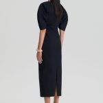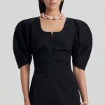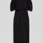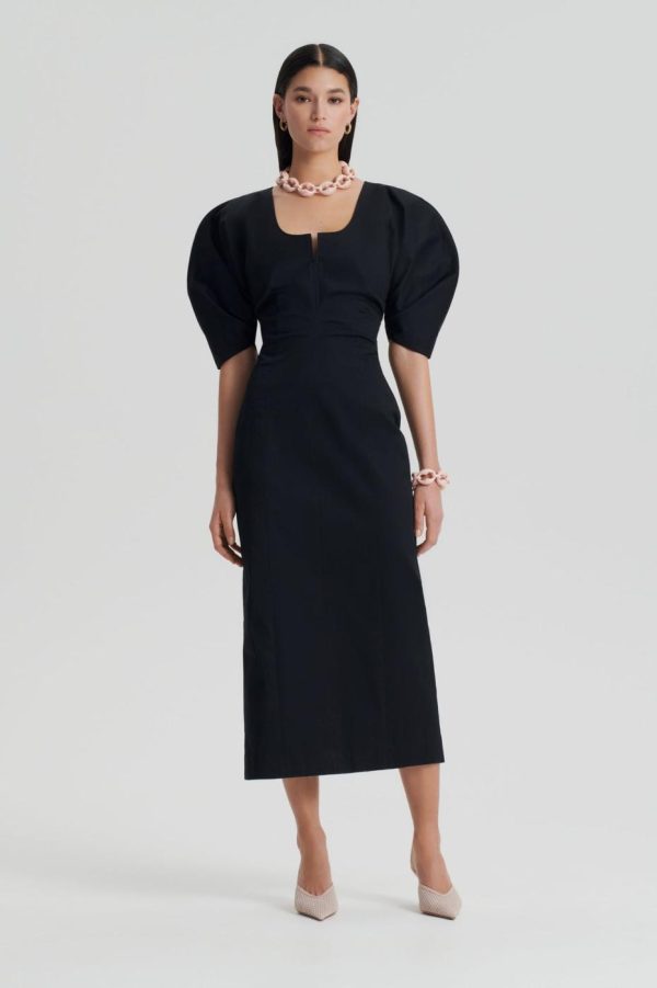 The Sateen Cotton Tailored Dress in black embodies refined femininity and considered craftsmanship. Cut from a crisp cotton blend, the mid-length dress is tailored to accentuate the waist, with statement cocoon sleeves and a scoop neckline featuring a sculptural v-split. Pair with accessories in complementary hues for a sophisticated ensemble.