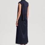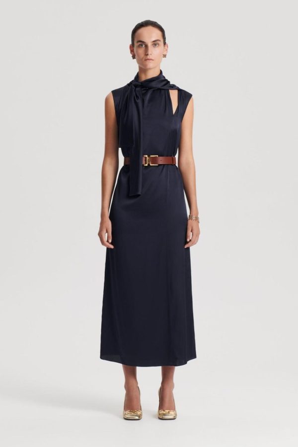 The Silk Cravat Dress balances modern femininity with refined elegance. Crafted from lustrous navy silk blend, the mid-length dress is characterised by a sophisticated cravat style neckline and draped detailing across the body. Pair with luminous jewellery and sleek accessories for a timeless occasion ensemble.