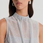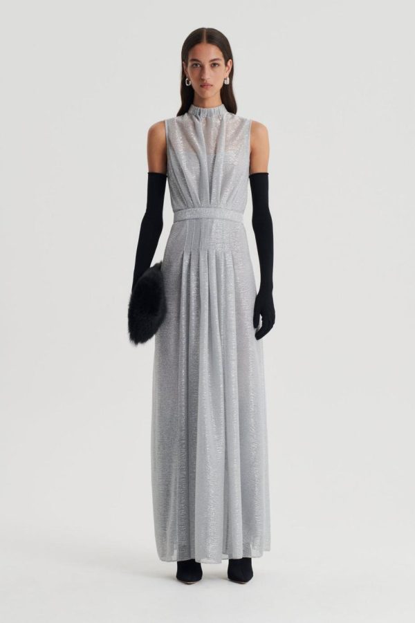 The Tinsel Gown is imbued with contemporary romanticism and high-impact glamour. Crafted from a metallic yarn fabrication from Greece, the sleeveless dress is embellished by intricate glitter detailing. The high neck silhouette tailored and pleated through the waist below falling to a voluminous, floor length skirt. Embody luminous femininity by pairing with elegant accessories for upcoming occasions.��