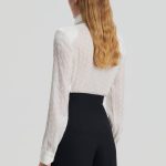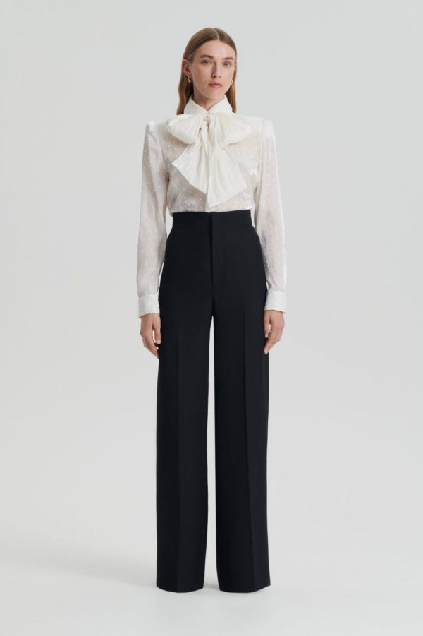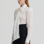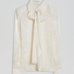 The Silk Shoulder Pad Shirt in a cream hue is an elegant interpretation of a timeless silhouette. Featuring intricate French embroidery in a three-dimensional spot design, the fabrication has been produced by a family-run mill that has been operating in Paris for over 100 years. The blouse is defined by a structured silhouette that is created by internal shoulder pads and elegant shirting design details. Choose to fasten the neck scarf into a feminine pussy bow or style undone for delicate detailing. Balance the fluid fabrication by pairing it with tailored trousers or Crepe Knit and sleek accessories.