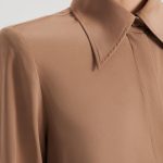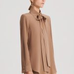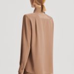 The Silk Shoulder Pad Shirt in camel is an elegant interpretation of a timeless silhouette. Crafted from 100% silk, the blouse is defined by a structured silhouette that is created by internal shoulder pads and elegant shirting design details. Choose to fasten the neck scarf into a feminine pussy bow or style undone for delicate detailing. Balance the fluid fabrication by pairing it with tailoring or Crepe Knit and sleek accessories.