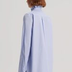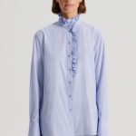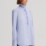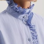 The Stripe Ruffle Trim Shirt is imbued with refined elegance. Lightly tailored from 100% cotton and patterned with pale blue stripes, the shirt is trimmed with ruffle detailing along the high neckline and button-up placket. Pair with tailoring in complementary hues or polished denim silhouettes for an outfit trending towards timelessness and wearability.