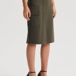 The Tailored Patch Pocket Skirt is reflective of refined sophistication. Crafted in a dark green colourway, the timeless silhouette features a front wrap construction and front button closure. Showcasing utility-inspired accents the mid-length skirt is detailed oversized flap pockets and a back split for ease of movement. Pair with silk or cotton shirting for a contemporary approach to workwear.