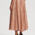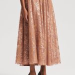 The Tinsel Floral Skirt draws invites timeless elegance to eveningwear codes. Crafted in France, the skirt is embellished by floral tinsel embroidery in a palette of champagne, peach and bronze. The voluminous skirt features a high-rise waist and mid-width waistband. Pair with the coordinating bustier and considered accessories for an evening ensemble imbued with sophisticated allure.