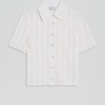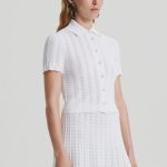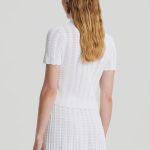 The Pleat Lace Shirt in white embodies contemporary femininity. Knitted in a decorative scallop stitch to create a lace pattern design, the shirt is crafted to a cropped silhouette featuring classic shirting accents. Style with the coordinating skirt and accessories in complementary hues for an elegant ensemble.
