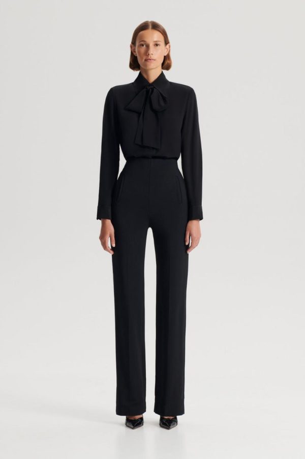 The Silk Shoulder Pad Shirt in black is an elegant interpretation of a timeless silhouette. Crafted from 100% silk, the blouse is defined by a structured silhouette that is created by internal shoulder pads and elegant shirting design details. Choose to fasten the neck scarf into a feminine pussy bow or style undone for delicate detailing. Balance the fluid fabrication by pairing it with tailored trousers or Crepe Knit and sleek accessories.