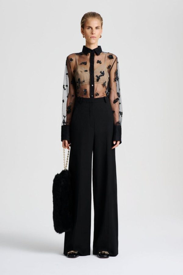 Interplaying relaxed silhouettes and masterful tailoring, the Gotham Tailored Trouser is the epitome of elegance. Crafted from a virgin wool blend, the classic black trouser is the perfect staple, reflective of a timeless dedication to craftsmanship that is synonymous with Scanlan Theodore. The wide-leg silhouette features a high-rise waist, belt loops, and dual side pockets. Pair with the coordinating jacket or a blouse and refined jewellery for a chic ensemble.