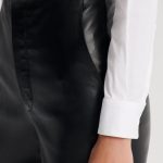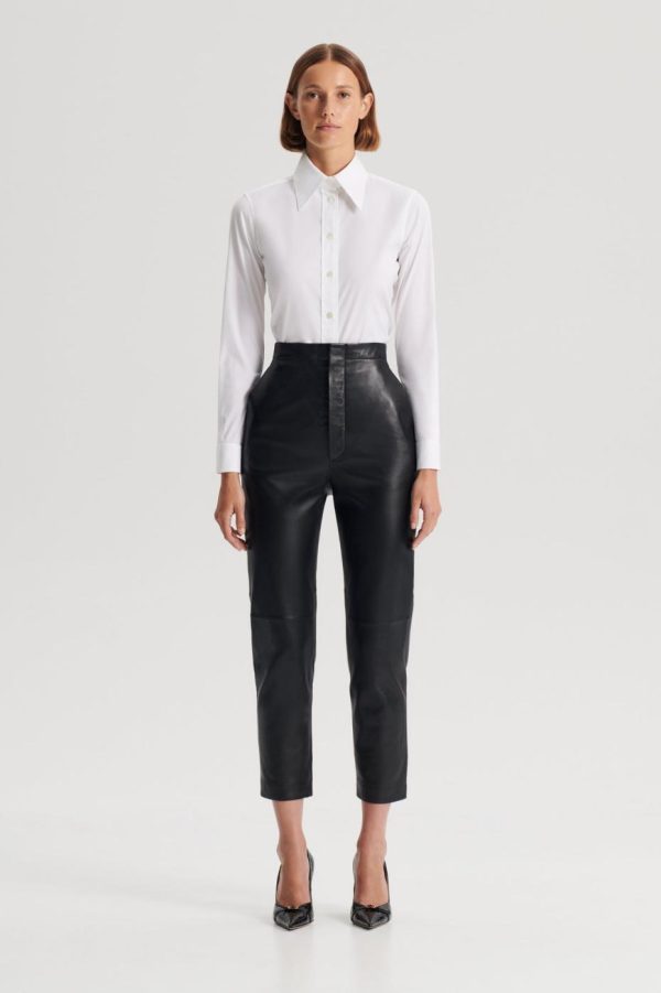 The Leather Slim Crop Trouser is an updated interpretation of a signature silhouette. Crafted from 100% black leather, the cropped trousers are tailored to a slim, straight leg silhouette. Style with mohair pieces for a luxurious textural combination, or pair with a blouse for a refined ensemble.