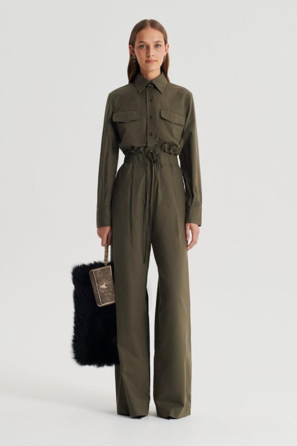 The Pleat Cargo Trouser in jungle interplays luxurious simplicity with contemporary aesthetics. Crafted from a crisp cotton blend, the wide leg silhouette is detailed with front pleat detailing, an elasticated waistband and an oversized back pocket. Pair back with tailored shirting or elevated wardrobe essentials for modern allure.